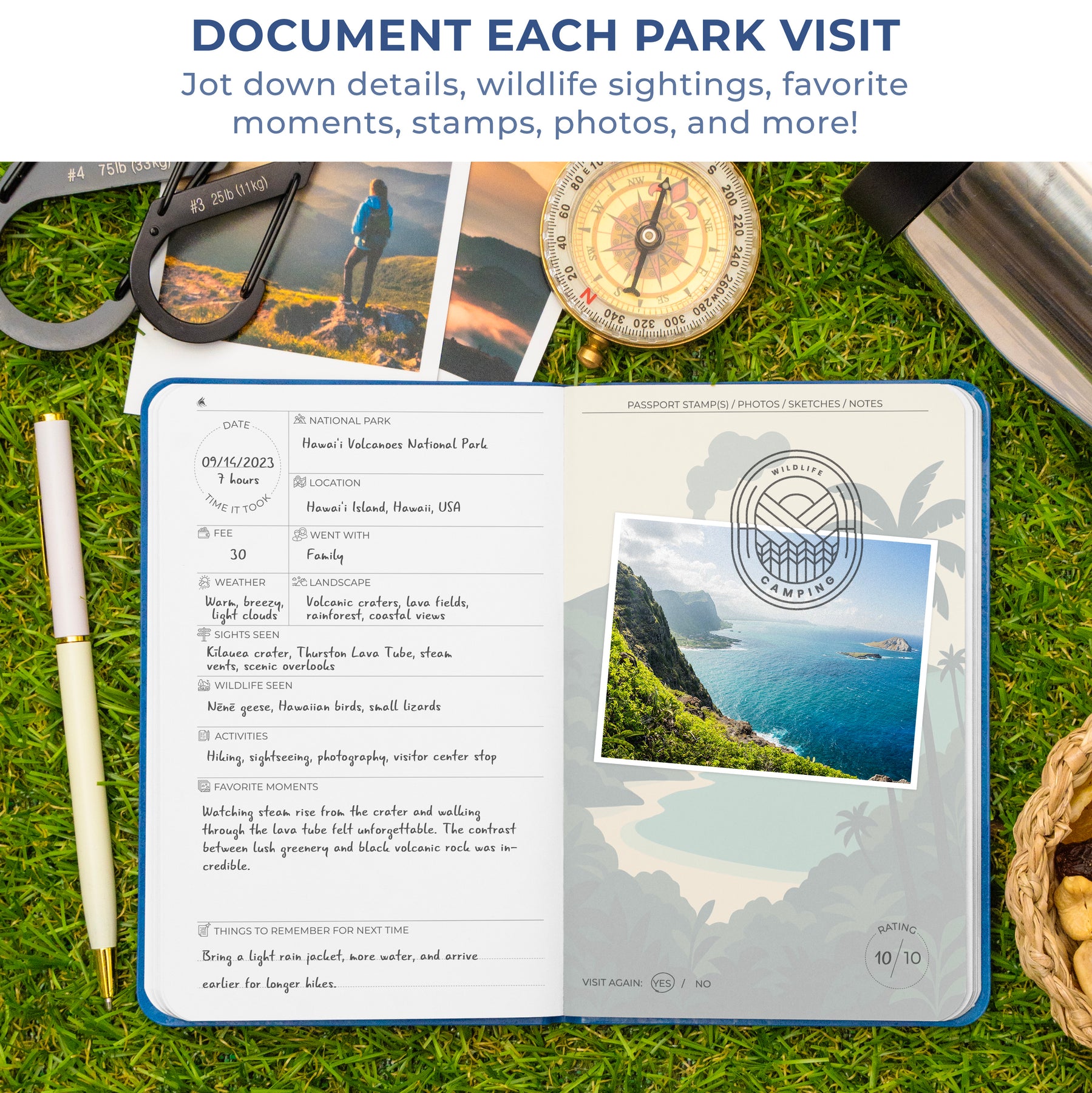RECORD THE DETAILS OF EACH ADVENTURE – Dedicated pages of this national park stamp book give you space to log the date, park name, location, fee, weather, activities, wildlife seen, favorite moments, and notes for next time.