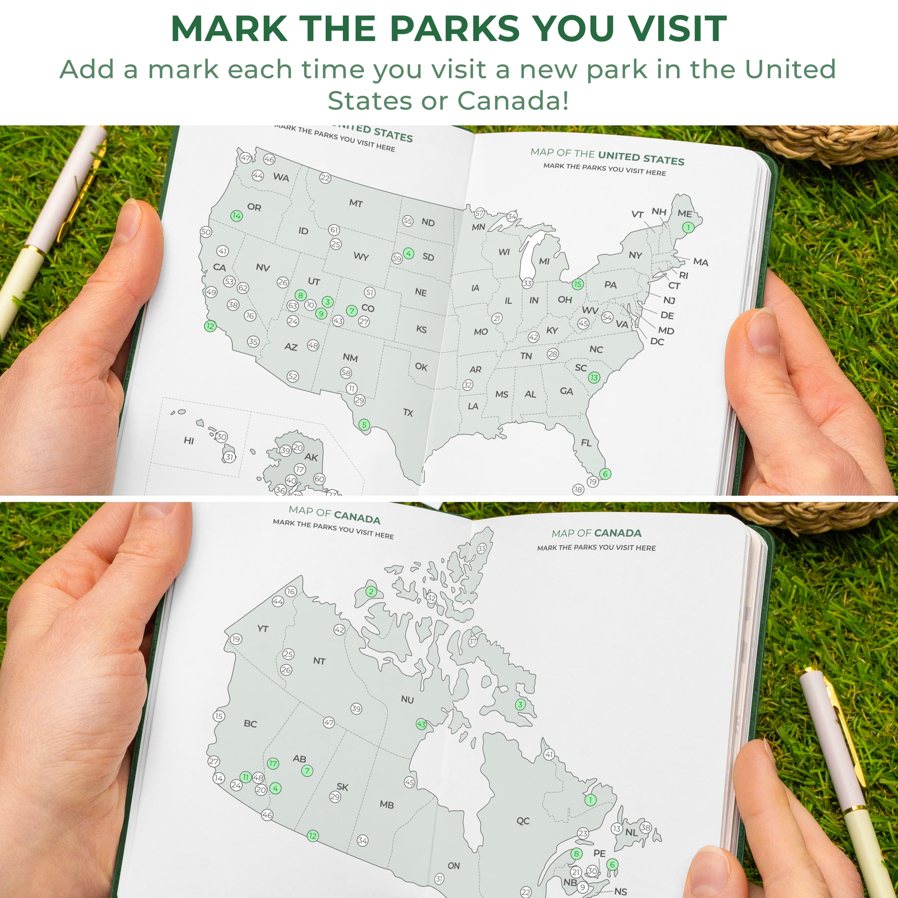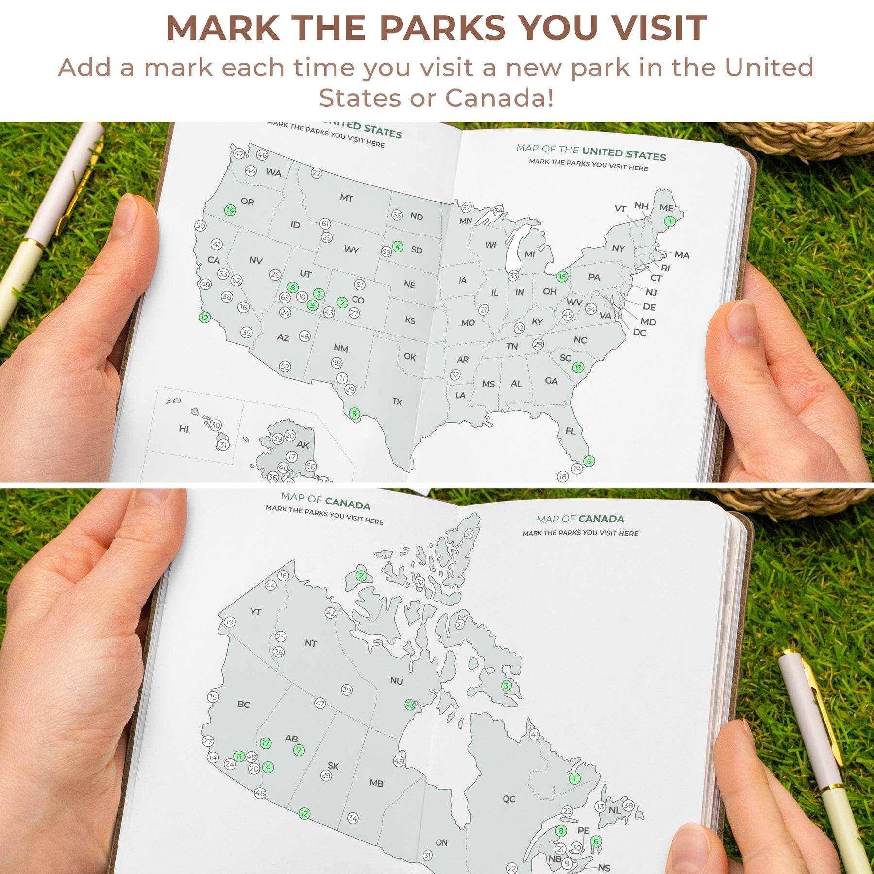 MARK THE PARKS YOU’VE VISITED – Includes maps of the United States and Canada so you can mark the parks you’ve explored and get inspired for future adventures.
