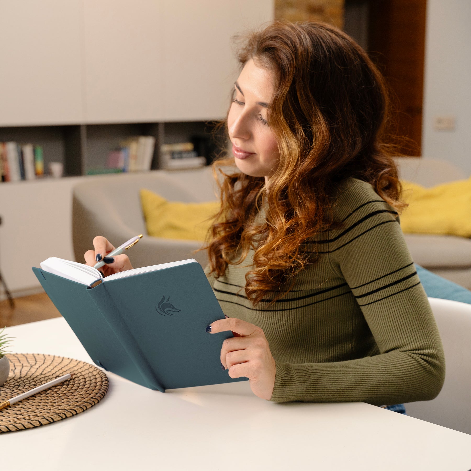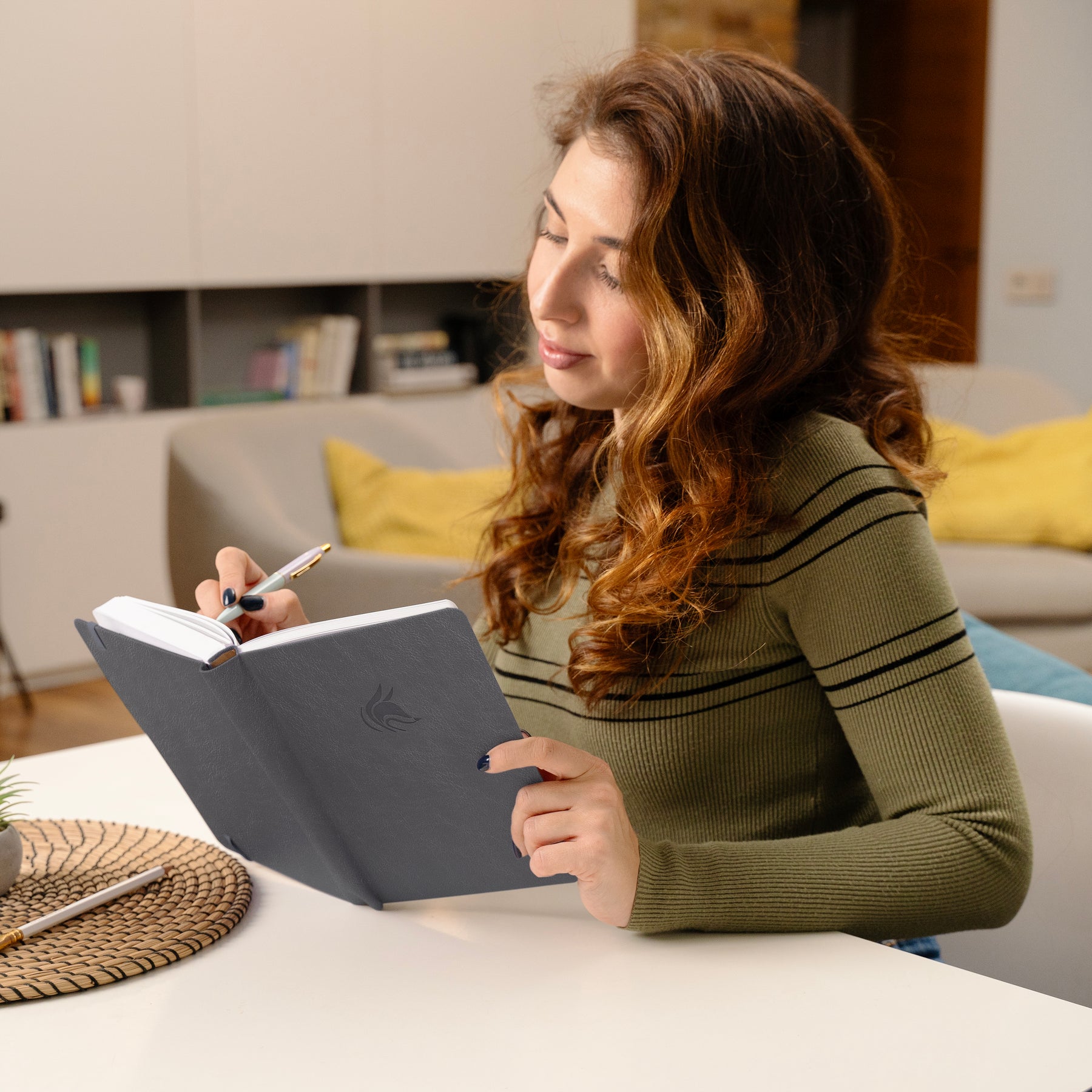 LAY-FLAT BINDING, THICK PAPER & STICKERS – This daily prompt journal for women and men measures 5.8 by 8.3 inches. The day-by-day journal has an eco-leather hardcover, thick 120gsm paper, elastic band, pen loop, lay-flat binding, and stickers.