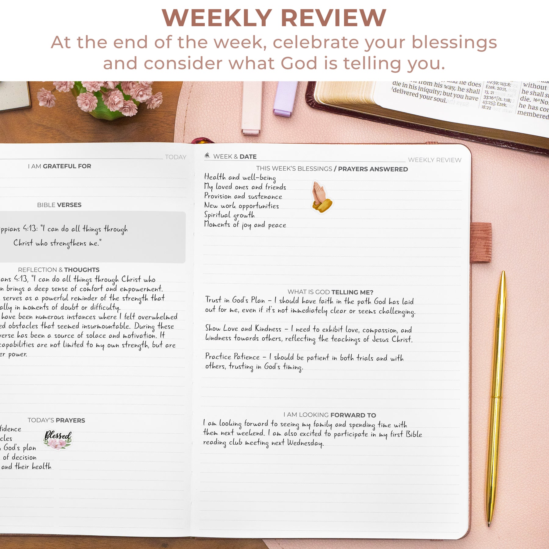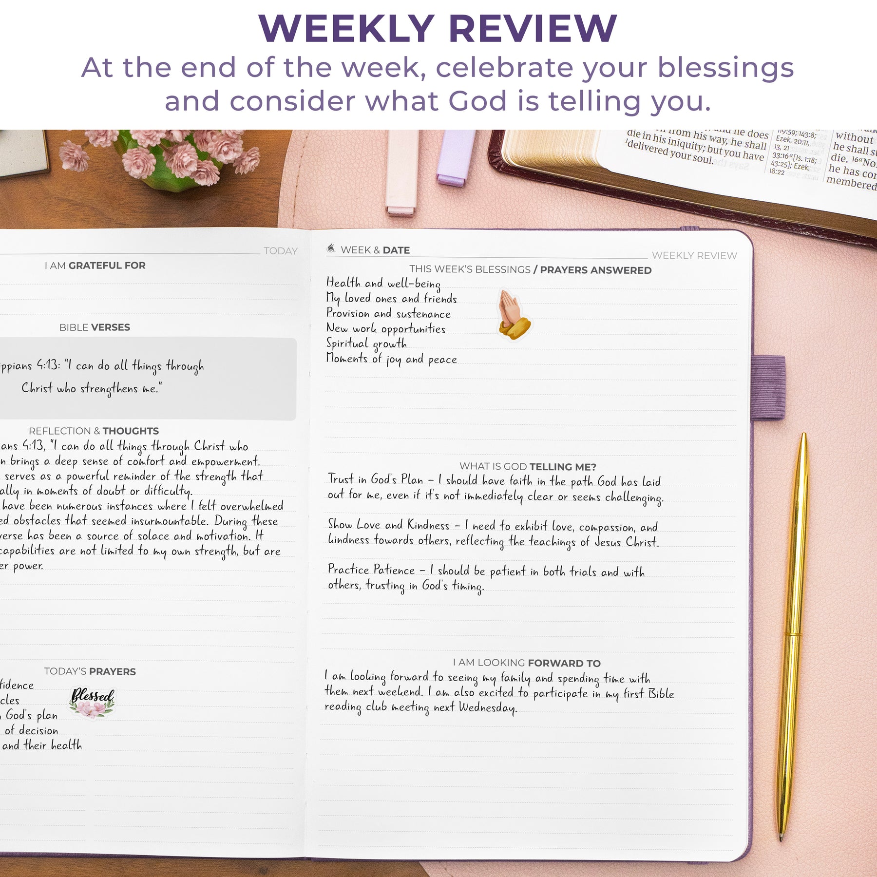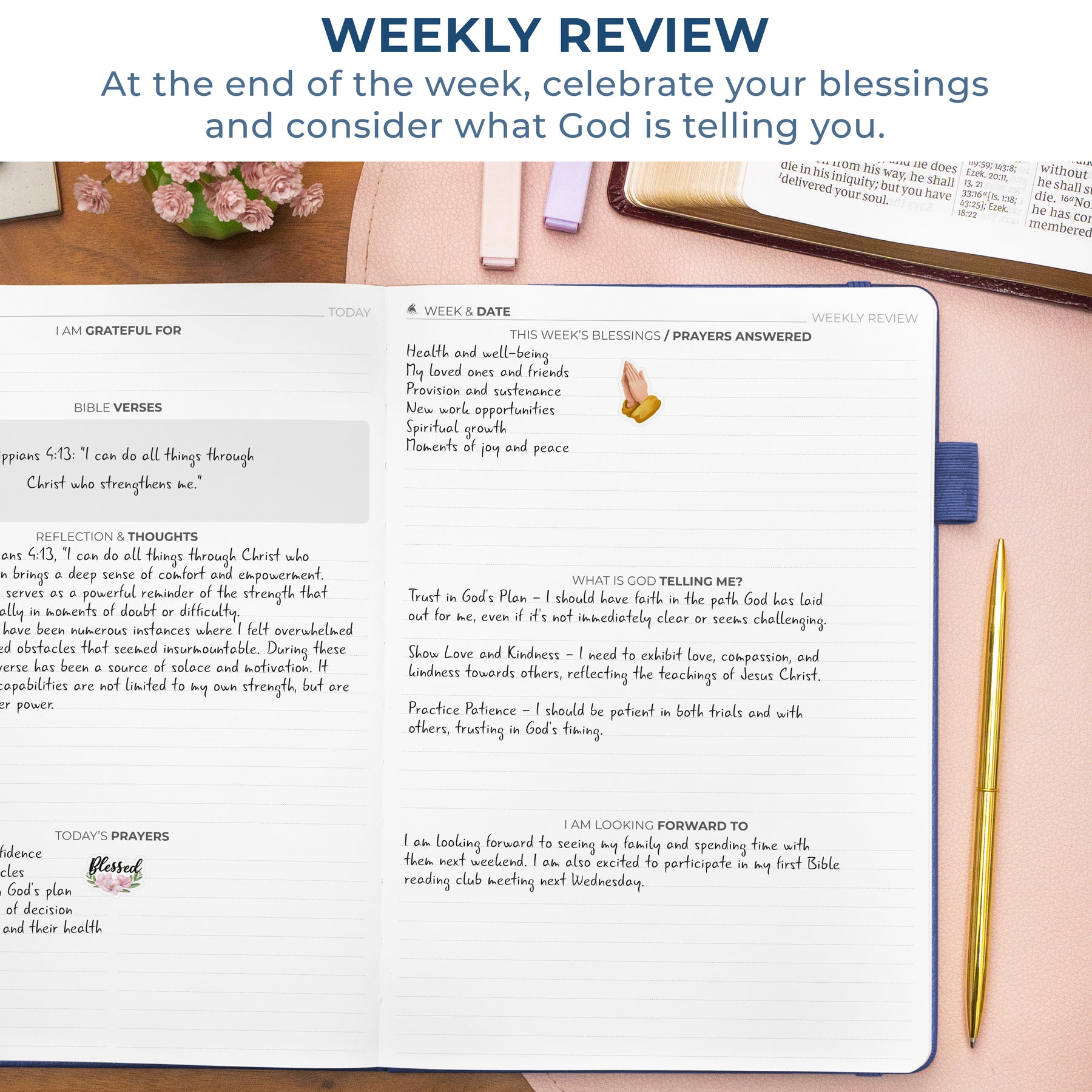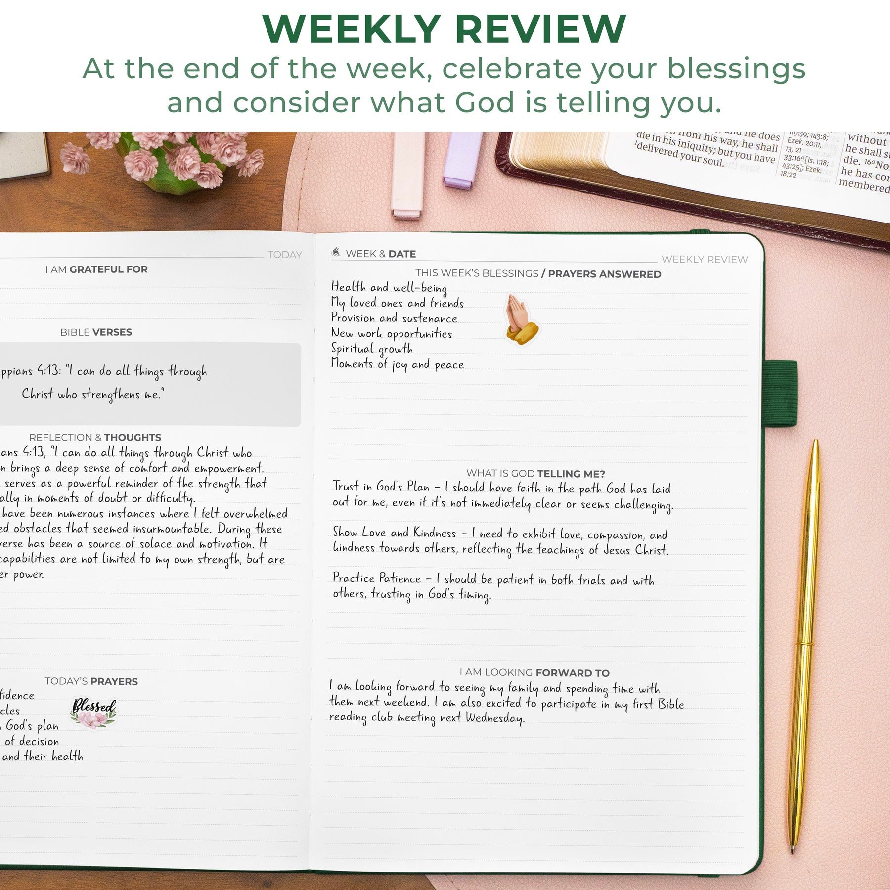 • CELEBRATE YOUR BLESSINGS & PRAYERS ANSWERED – Each week of the Bible notebook journal includes a review page to reflect on your blessings and prayers answered, consider what God is telling you, and acknowledge the things you are looking forward to.