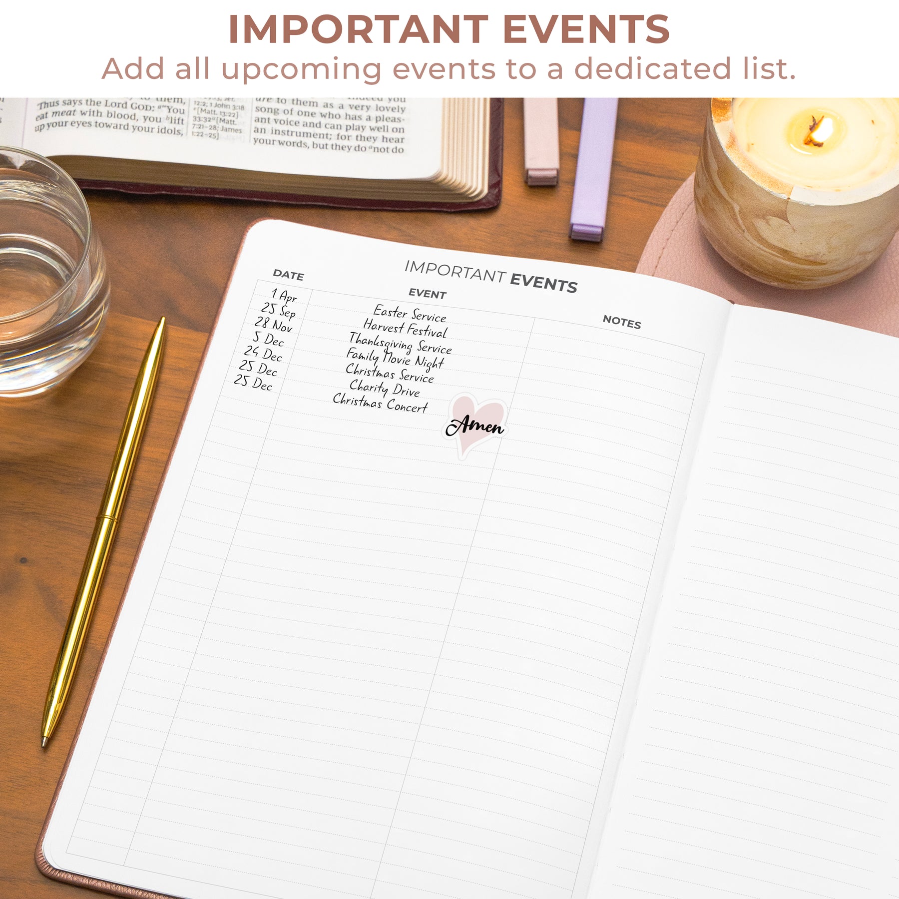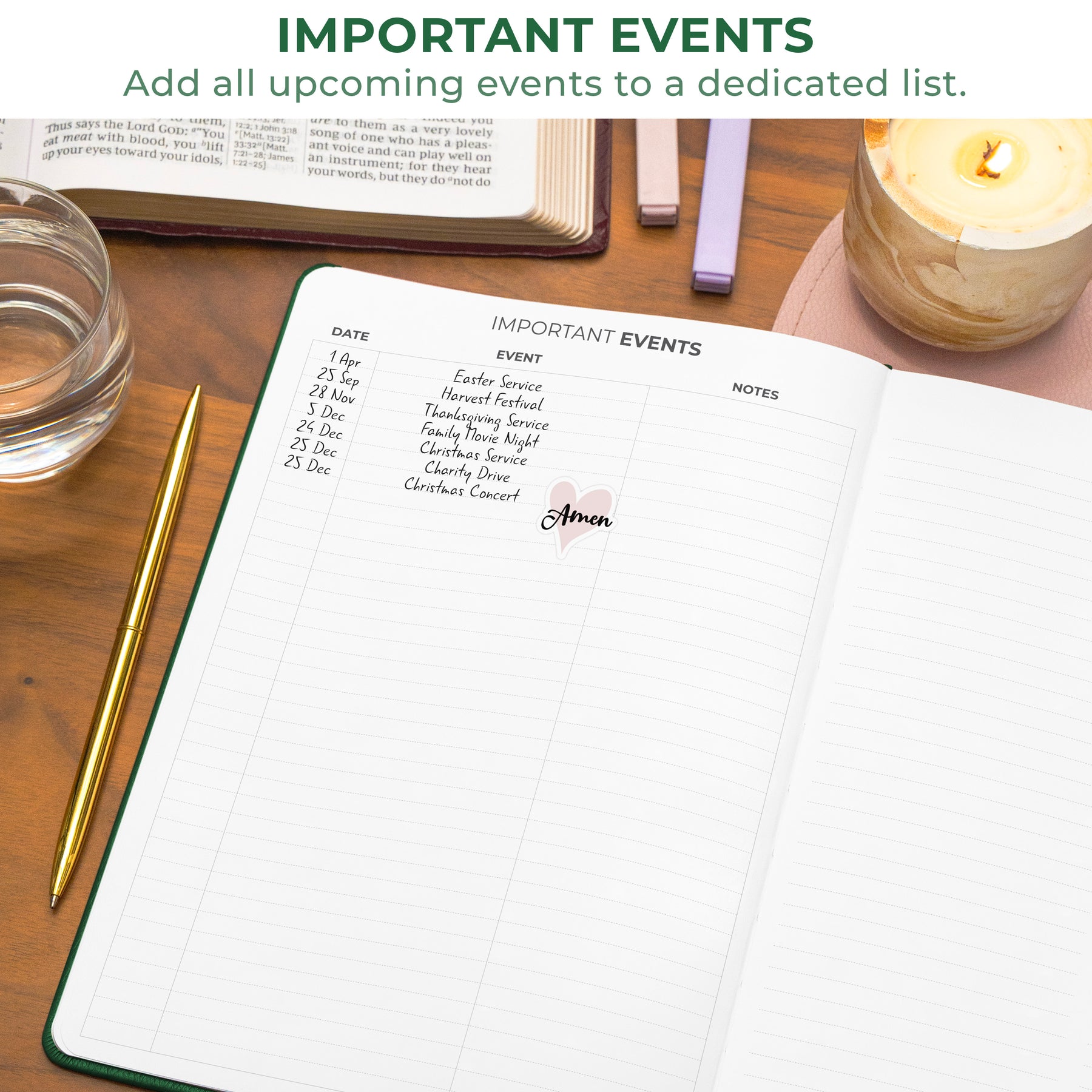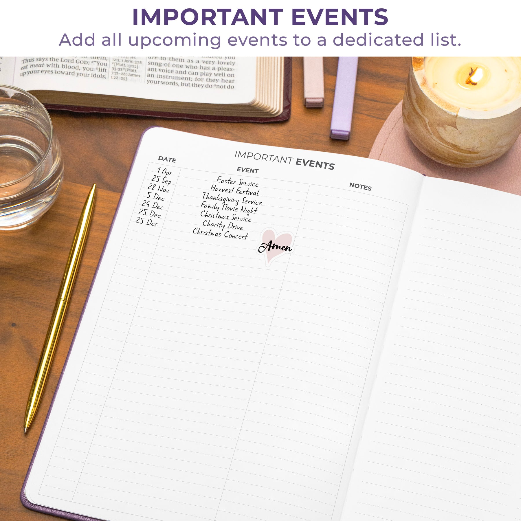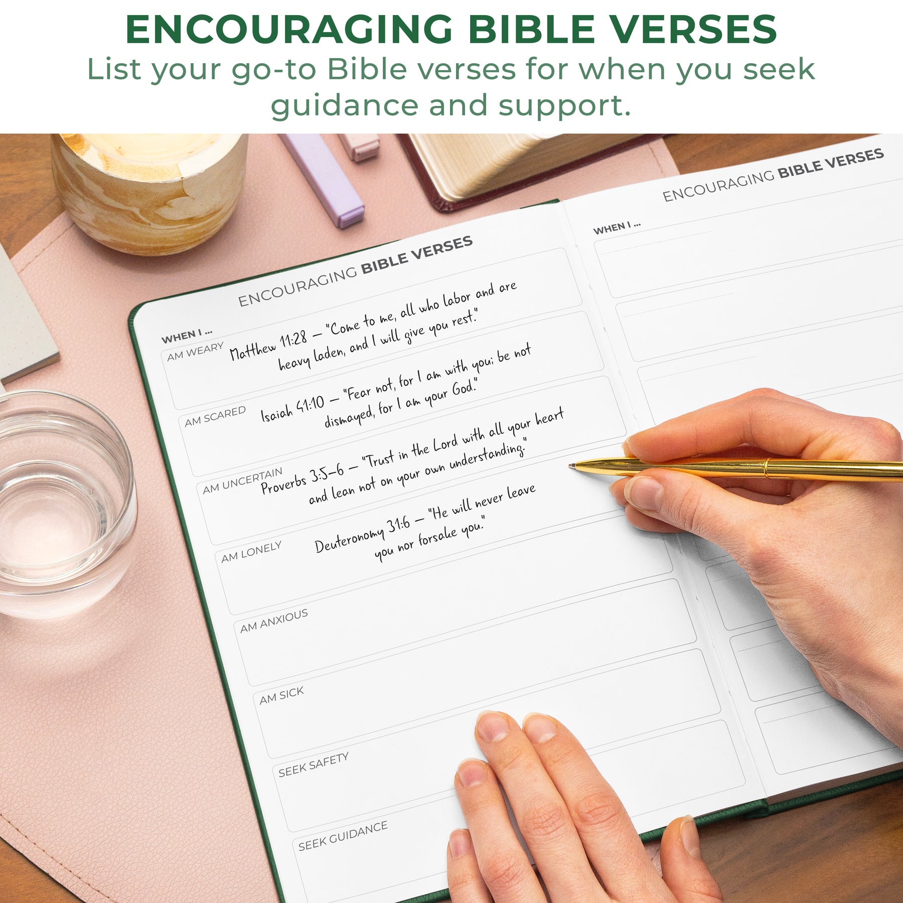 • SPACE FOR IMPORTANT EVENTS, BIBLE VERSES & PRAYERS – At the front of the faith journal notebook, you will find pages for important events, your go-to encouraging Bible verses, and prayers. At the back, there is a storage pocket for loose papers.