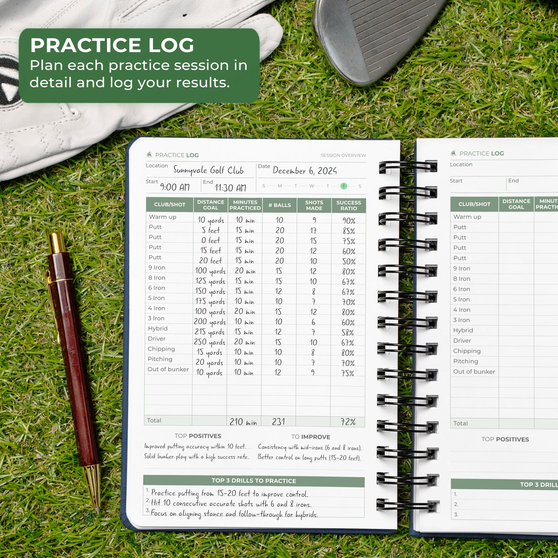 PLAN YOUR PRACTICE & IMPROVE RESULTS – Use the practice logs to organize your training sessions, calculate success ratios for each club and shot, and identify areas for improvement, helping you refine your skills over time.